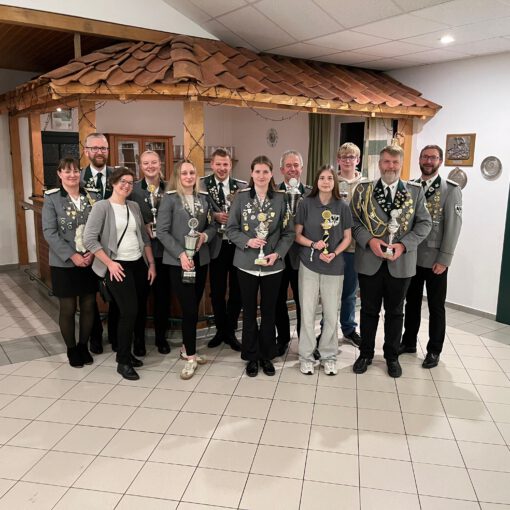 Weiterhin konnten 17 Kinder für ihre Teilnahme am Übungsschießen belohnt werden. Der erste Platz ging an Amelie Keck mit 953 Ring, der zweite Platz an Tom Diekherbers mit 939 Ring und der dritte Platz ging an Eva zur Borg mit 938 Ring. Die Wanderplakette der Jugend sicherte sich Eva zur Borg.